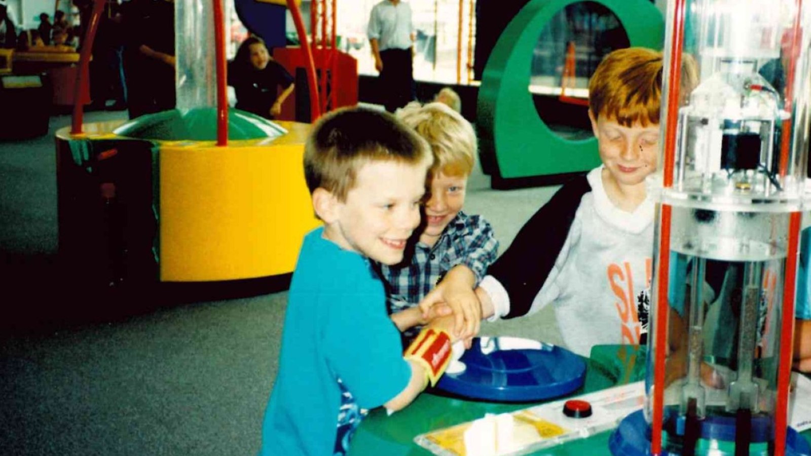Cyfarwyddwr Profiadau Gareth McTiffin [canol] yn Techniquest fel plentyn.