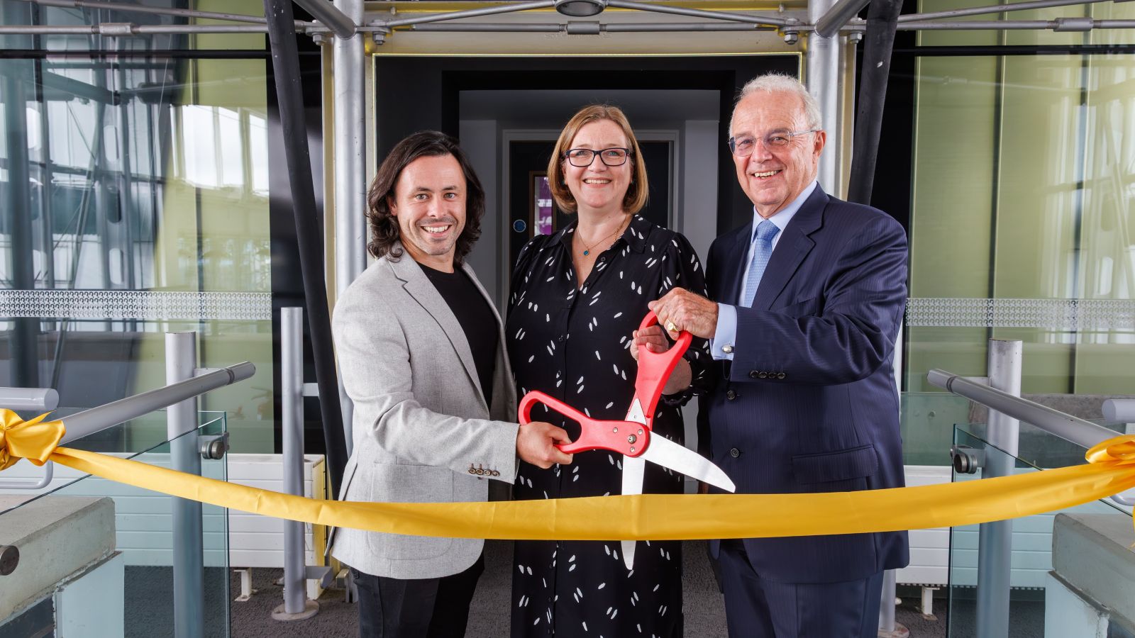 Dan O’Toole [chwith], CEO Sue Wardle [canol] a Hugh Inman, cynrychiolwr y DU o’r Sefydliad Bradbury [de], yn agor y Parth Bradbury Creu a Siapio.